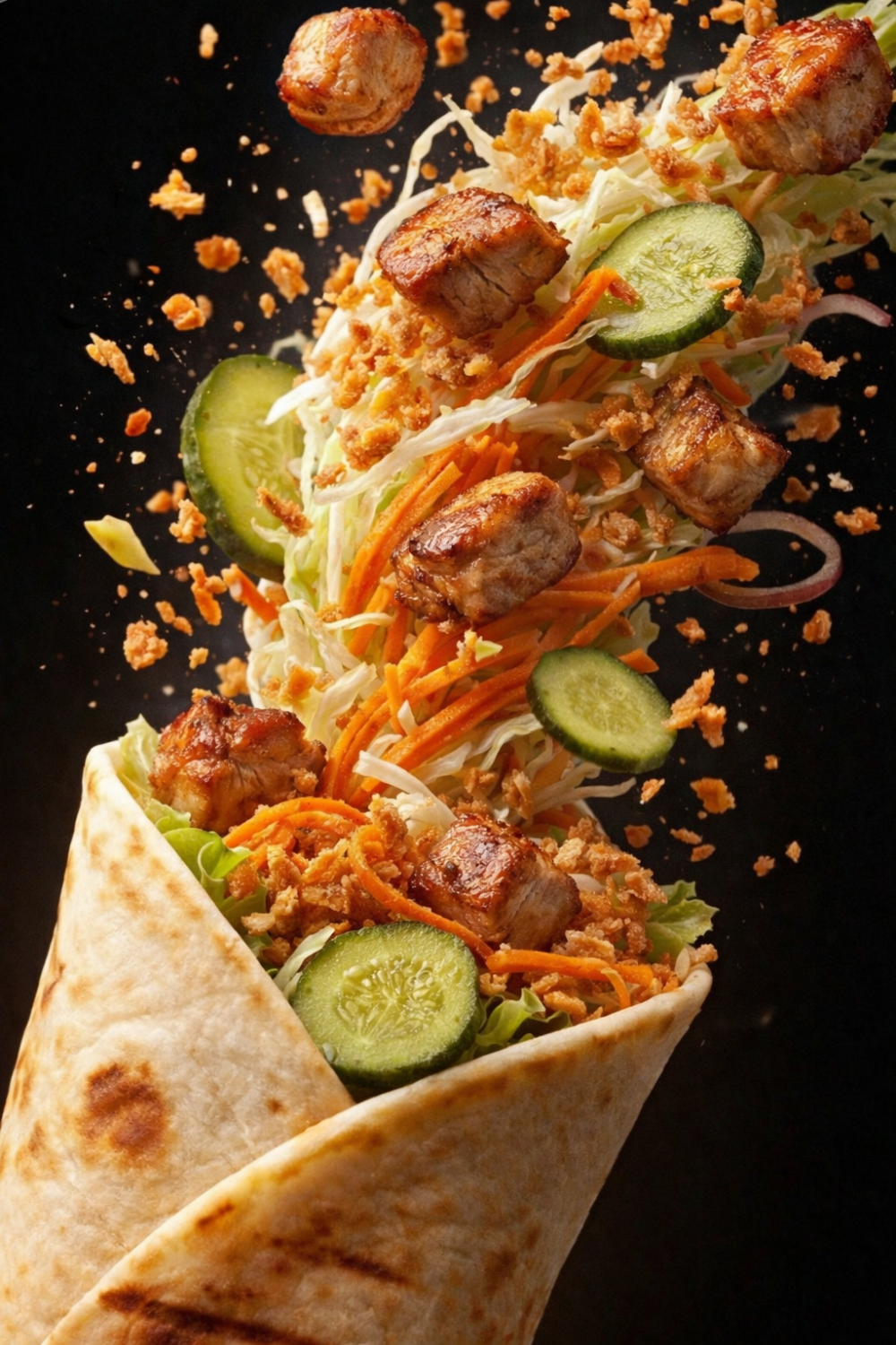 Лаваш, свинина, хрустящая капуста, морковь по-корейски, огурец маринованный, лук кранч, кетчуп, майонез, соус фирменный