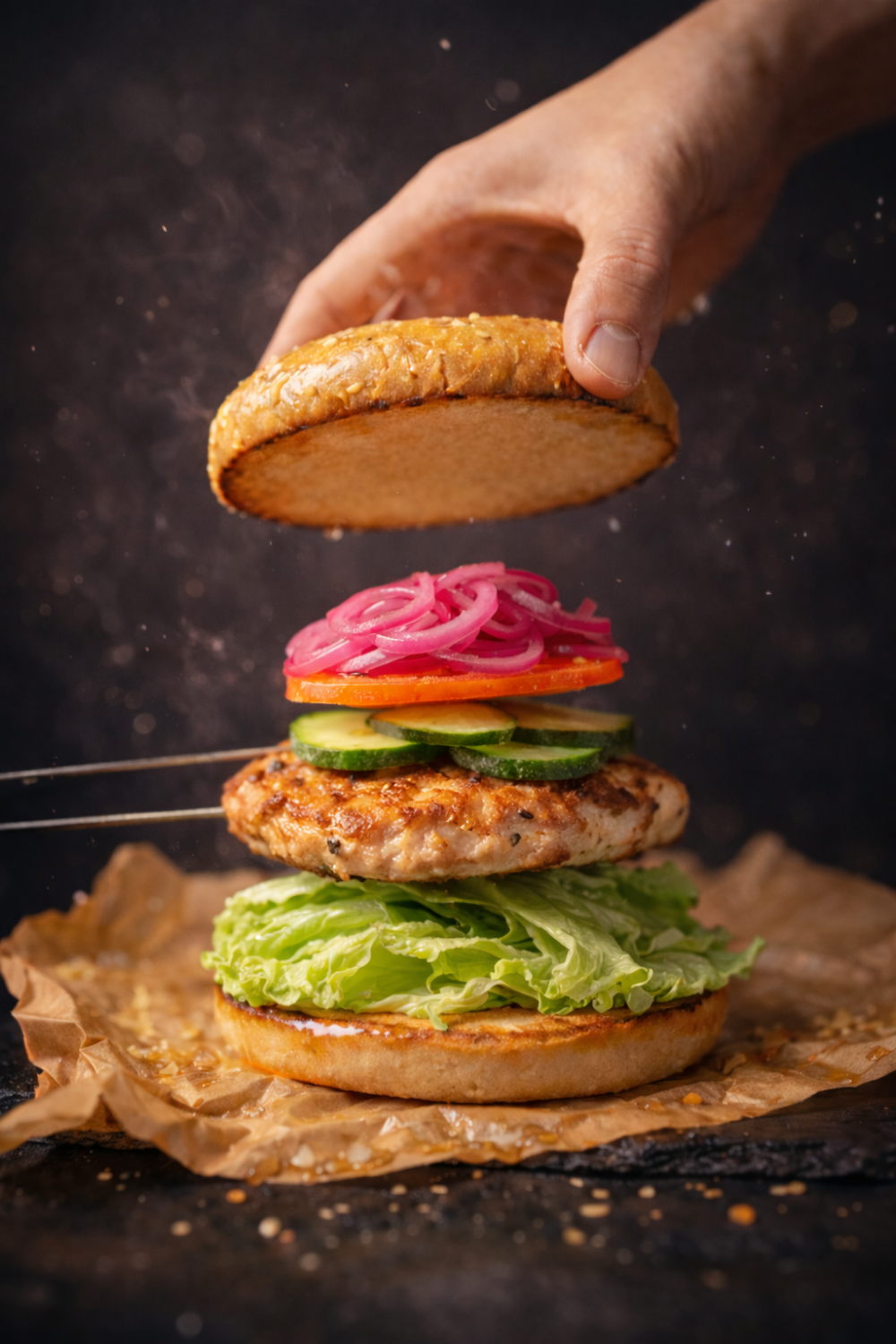 Ароматная булочка, куриная котлета, листья салата, томат, свежий огурчик, лук маринованный, соус фирменный, соус BBQ