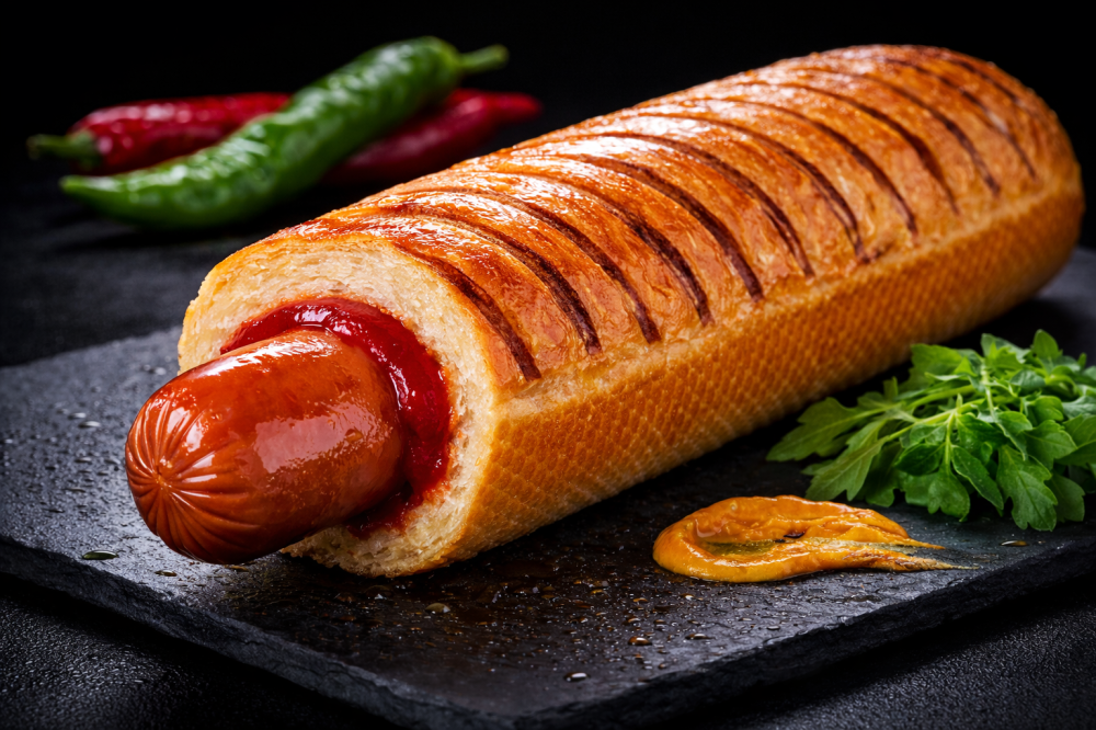 Булочка, фирменная колбаска, кетчуп, майонез, горчичный соус