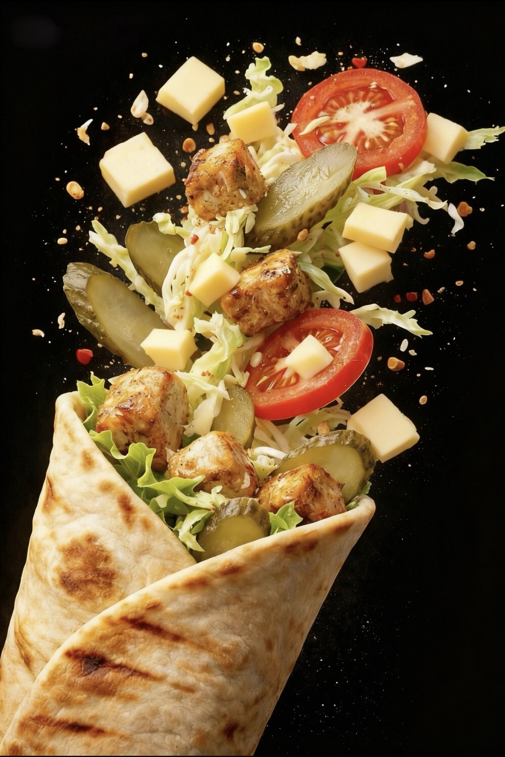 Лаваш, курица, капуста, сыр, солёный огурчик, томат, майонез, соус сырный