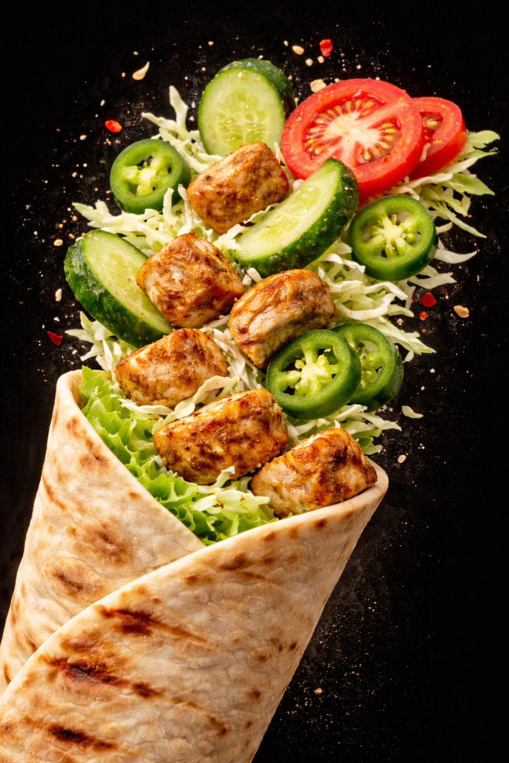 Лаваш, курица, хрустящая капуста, халапеньо, свежий огурчик, томат, соус фирменный, майонез, соус Шрирача