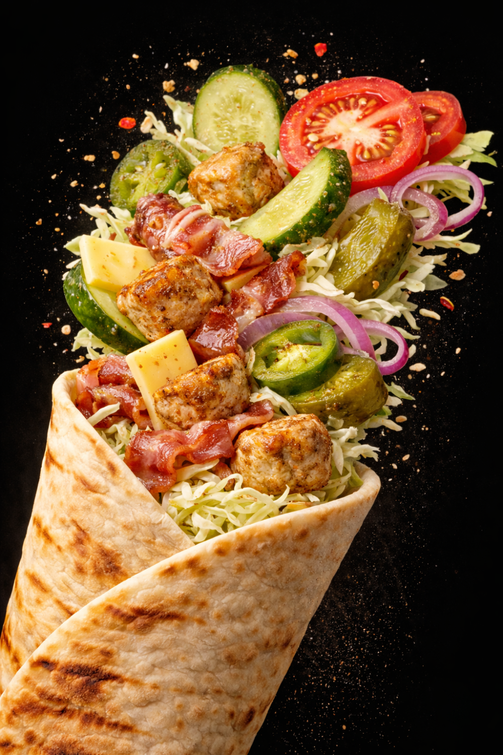 Лаваш, курица, бекон, сыр, хрустящая капуста, томат, соленый огурчик, майонез, соус фирменный, соус BBQ