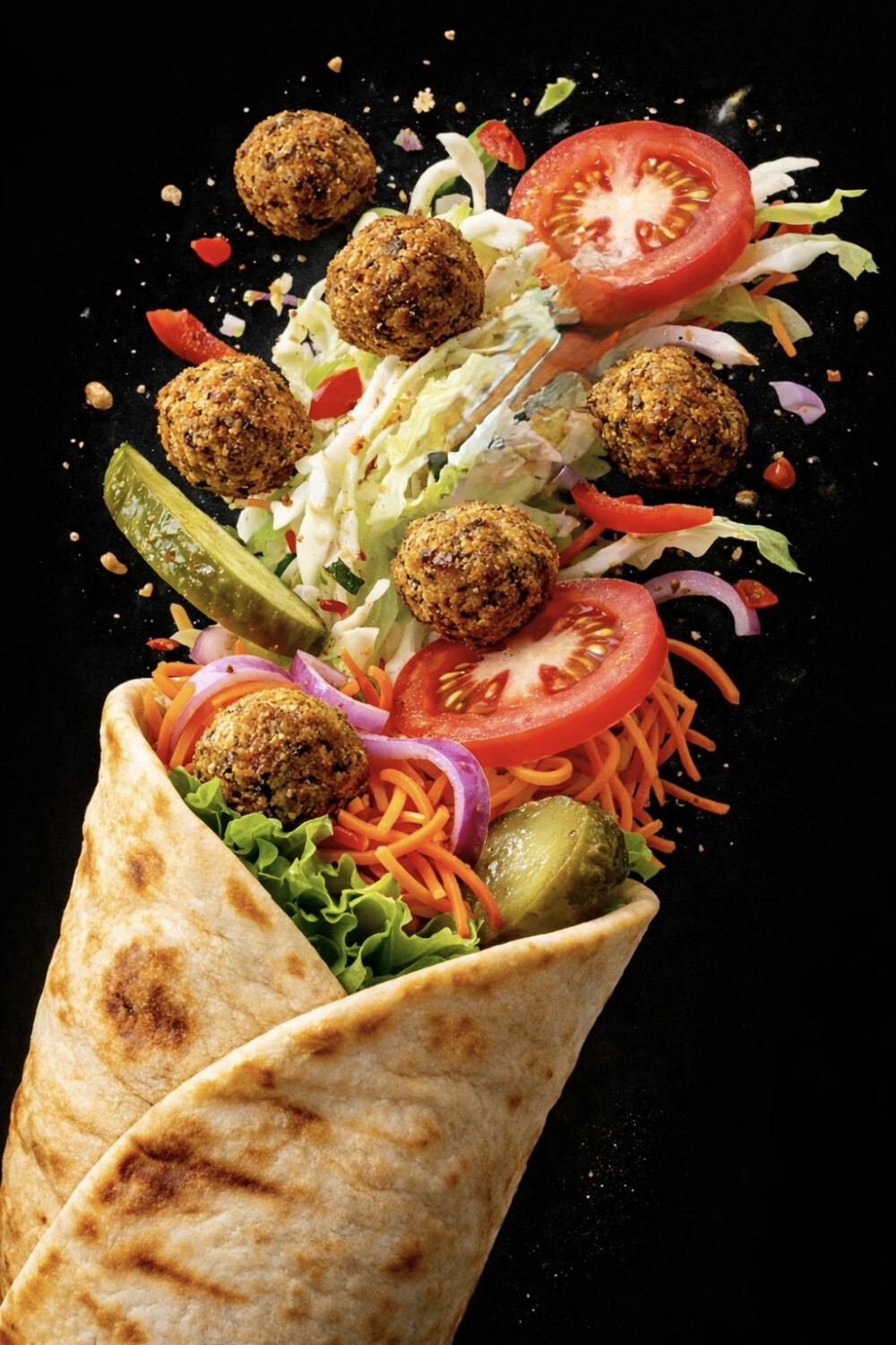 Лаваш, фалафель, хрустящая капуста, болгарский перец,томат, морковь по-корейски, солёный огурчик, маринованный лук, майонез, кетчуп, соус фирменный, соус BBQ